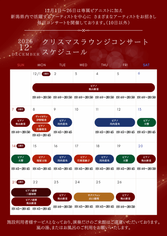 毎晩専属ピアニストや新潟県内外で活躍する演奏家が日替わりで出演し、旅の夜をやさしく彩ります。