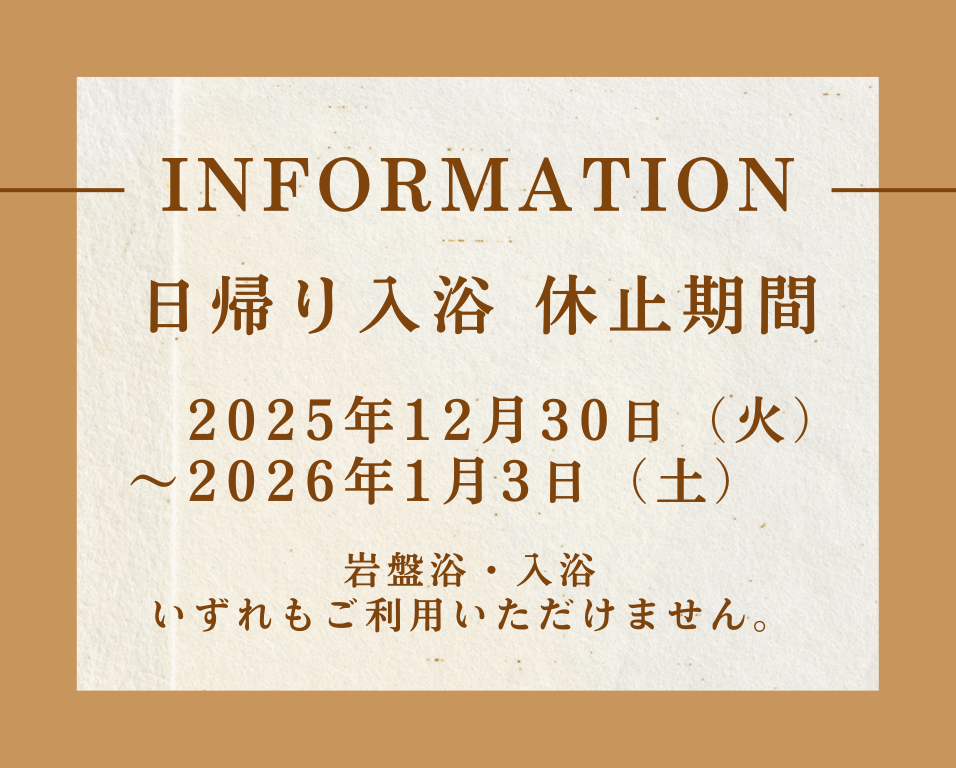 当館では年末年始の混雑緩和のため、日帰り岩盤浴「嵐の湯」および日帰り入浴のご利用を、下記期間中休止させていただきます。