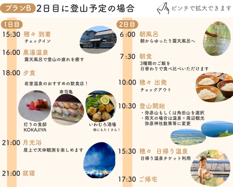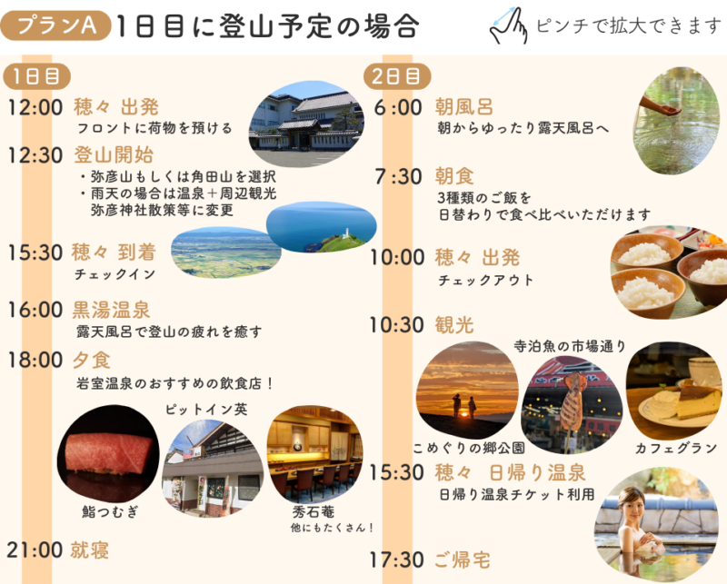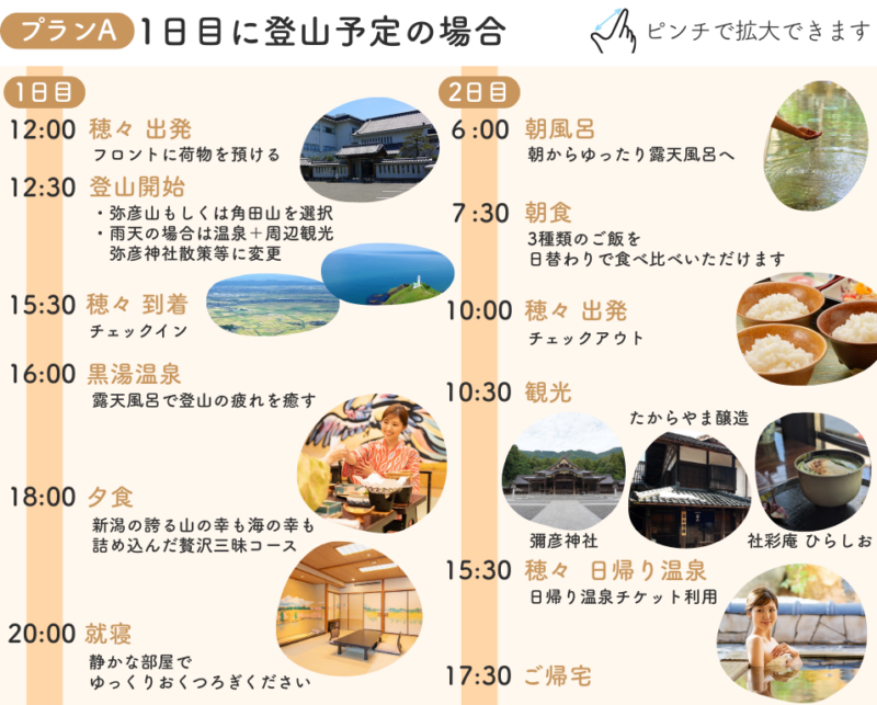 下山後は岩室温泉でゆっくり入浴し、身体を癒す滞在を。