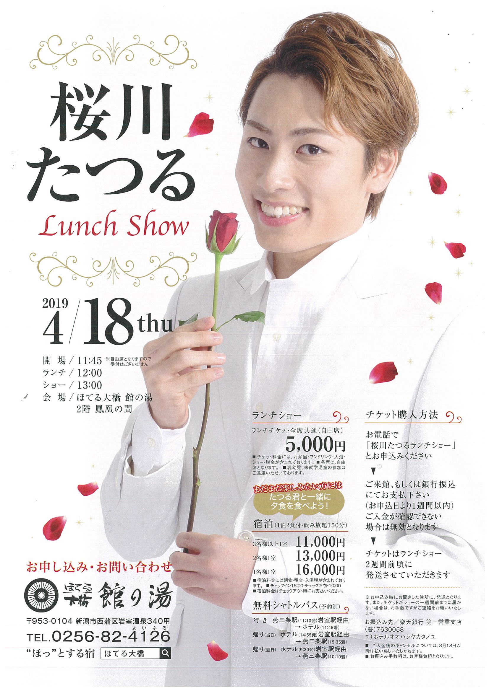みなさま、今日はほてる大橋“初”のランチショーのご案内です(^o^) ぽかぽか陽気の季節にピッタリ! さわやかな方が、再びほてる大橋にいらっしゃいます 新潟が生んだイケメン演歌歌手 桜川たつるさんです! 今回はランチショーなので、料金もお手頃ですし、気軽にお楽しみいただけます♪ 大橋でお呼びするのは今回で2回目 前回も盛り上がりましたが、今回はさらに盛り上がる予感! なぜかというと… ↓ ↓ ↓ ↓ ↓ ↓ ↓ ↓ ↓ ↓ たつるさんと混浴できるのでーーーす♡♡♡ ※注意※ ①混浴といっても、嵐の湯(岩盤浴)のことですのでご容赦くださいませ ②嵐の湯の使用料は、通常料金の半額(¥1080)です ③必ず作務衣着用です。 恥ずかしがり屋な方でも、たつるさんと一緒に混浴を楽しめますよ(*^_^*) さらにさらに! お時間がある方は、ディナー付き宿泊プランを追加でご利用いただくことも可能です! たつるさんと一緒にディナーも楽しめますよ~♪ 歌も素敵ですが、おしゃべりも上手なたつるさんと素敵な1日を過ごしませんか? ご予約はもちろんのこと、お問い合わせだけでも大歓迎です! ◆日時 2019/4/18(木) 会場/11:45 ランチ/12:00 ショー/13:00 ※自由席の為、受付はございません ◆会場 〒953-0104 新潟県新潟市西蒲区岩室温泉340甲 ほてる大橋 館の湯 2階 鳳凰の間 ◆チケット ランチショー 5000円(自由席) ※お弁当・ワンドリンク・入浴・ショー・税金が含まれます。 ※お申込開始当日、電話が大変混み合う事が予想されます。予めご了承ください。 ※乳幼児、未就学児童の参加はご遠慮いただいております。 ◆宿泊 3名様以上1室 11,000円 2名様1室 13,000円 1名様1室 16,000円 ※宿泊料金には、一泊二食付・飲み放題150分・消費税・入浴税が含まれております。 ※チェックイン15:00 チェックアウト10:00 ◆無料シャトルバスのご案内(予約制) 行き 燕三条駅(11:10発)→岩室駅経由→ホテル(11:45着) 帰り(当日) ホテル(14:55発)→岩室駅経由→燕三条駅(15:35着) 帰り(翌日) ホテル(9:30発)→岩室駅経由→燕三条駅(10:10着) ◆お申込み方法 1・お電話で「桜川たつる ランチショー」とお申込みください。 2・ご来館・もしくは銀行前払い振込にてお支払いください。(お申込日より1週間以内) 3・チケットはランチショー2週間前頃に発送いたします。 ※ご入金後のキャンセルにつきましては、2019/3/18以降は払戻しいたしかねます。 ※お振込み手数料は、お客様負担となります。 ◎お振込先◎ 楽天銀行 第一営業支店 (普)7630058 ユ)ホテルオオハシヤカタノユ ほてる大橋 館の湯 TEL: 0256-82-4126(9:00~19:00)![]()