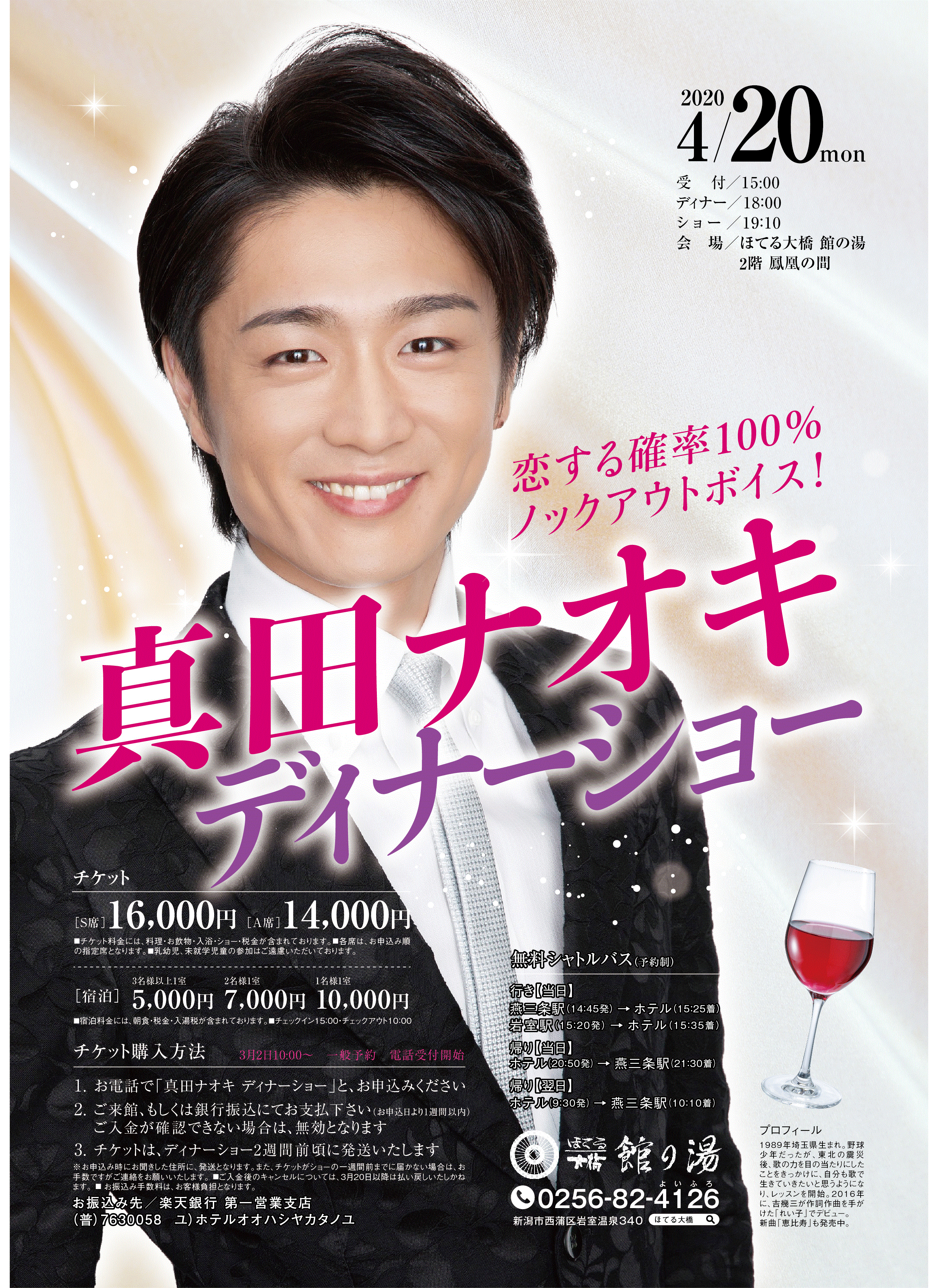 1・お電話で「真田ナオキ ディナーショー」とお申込ください。
